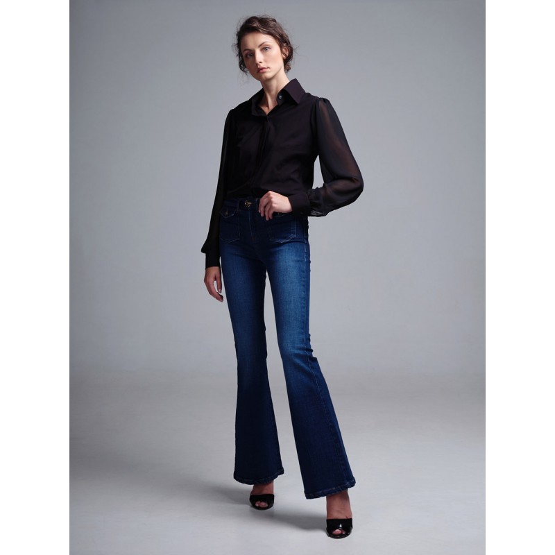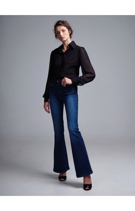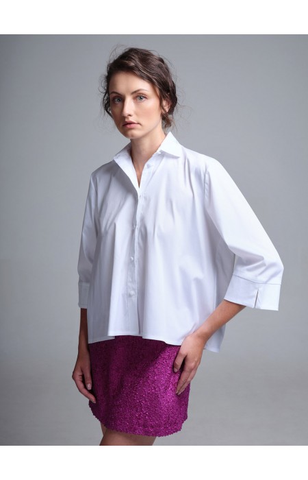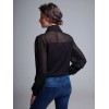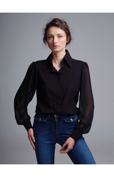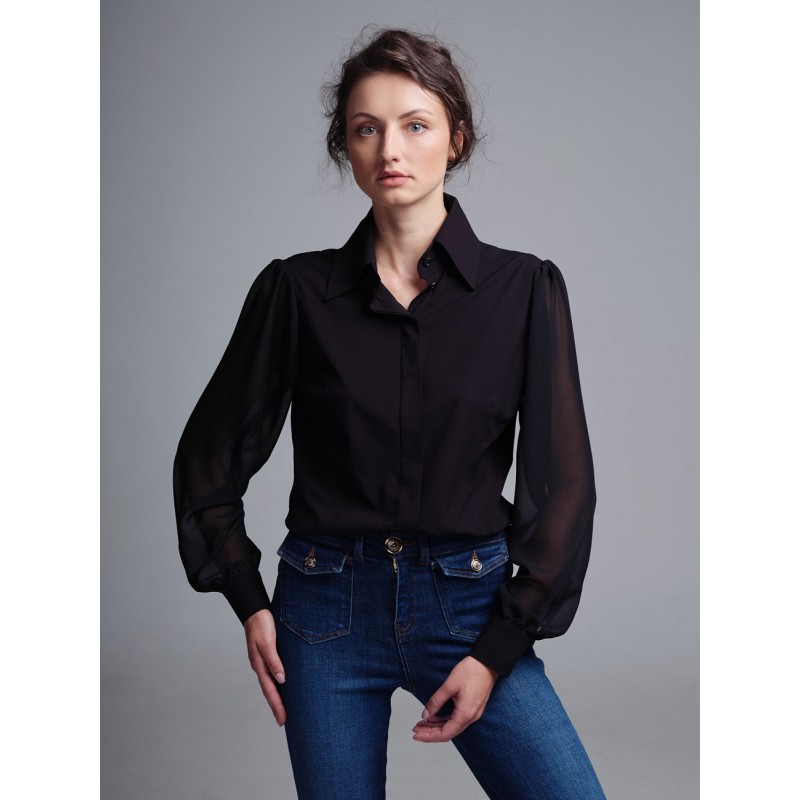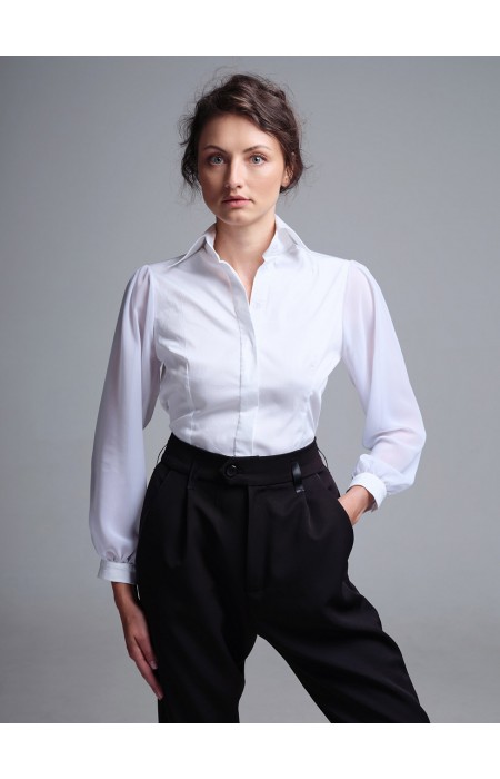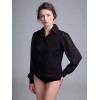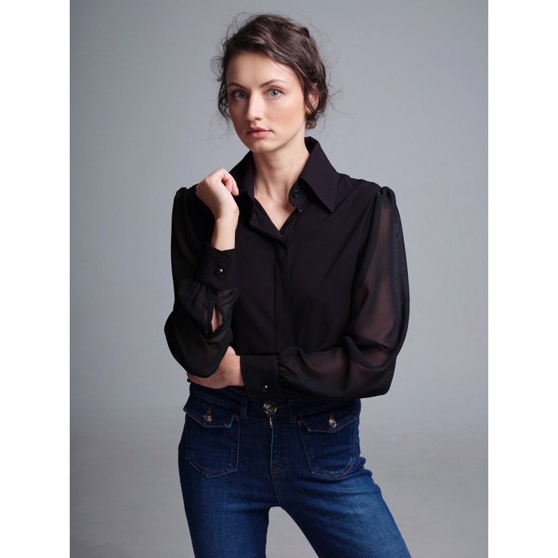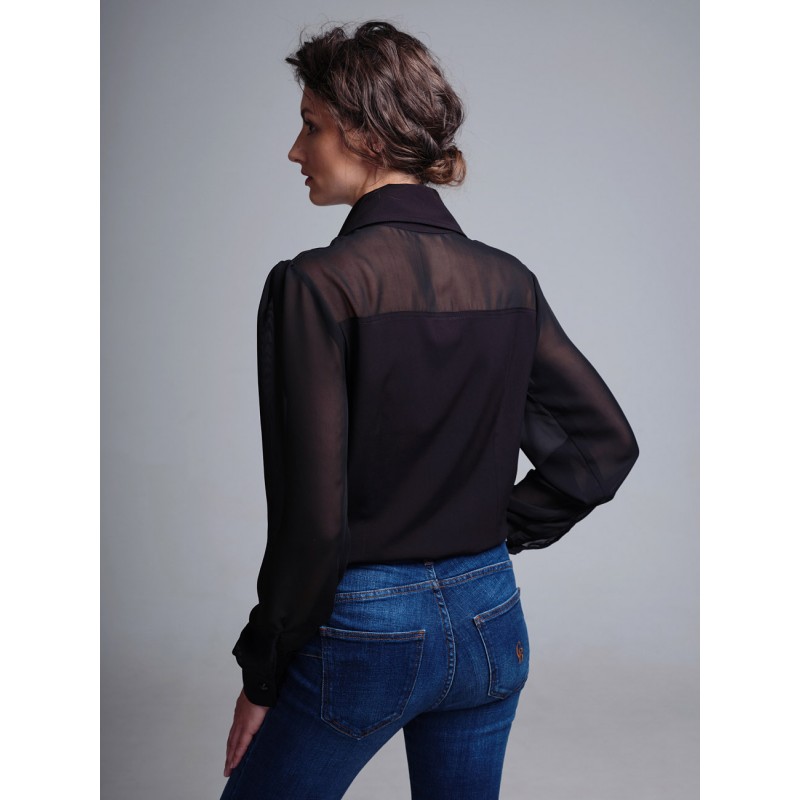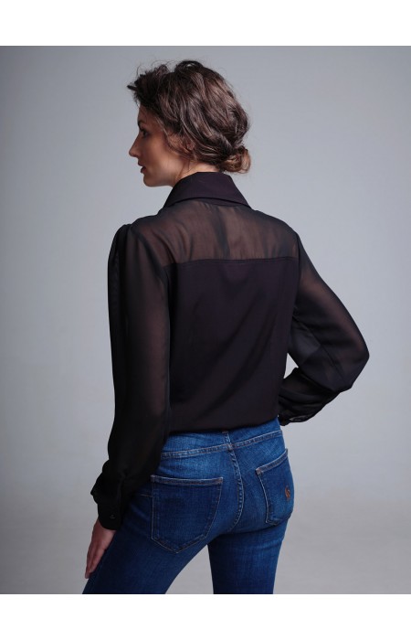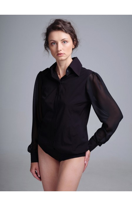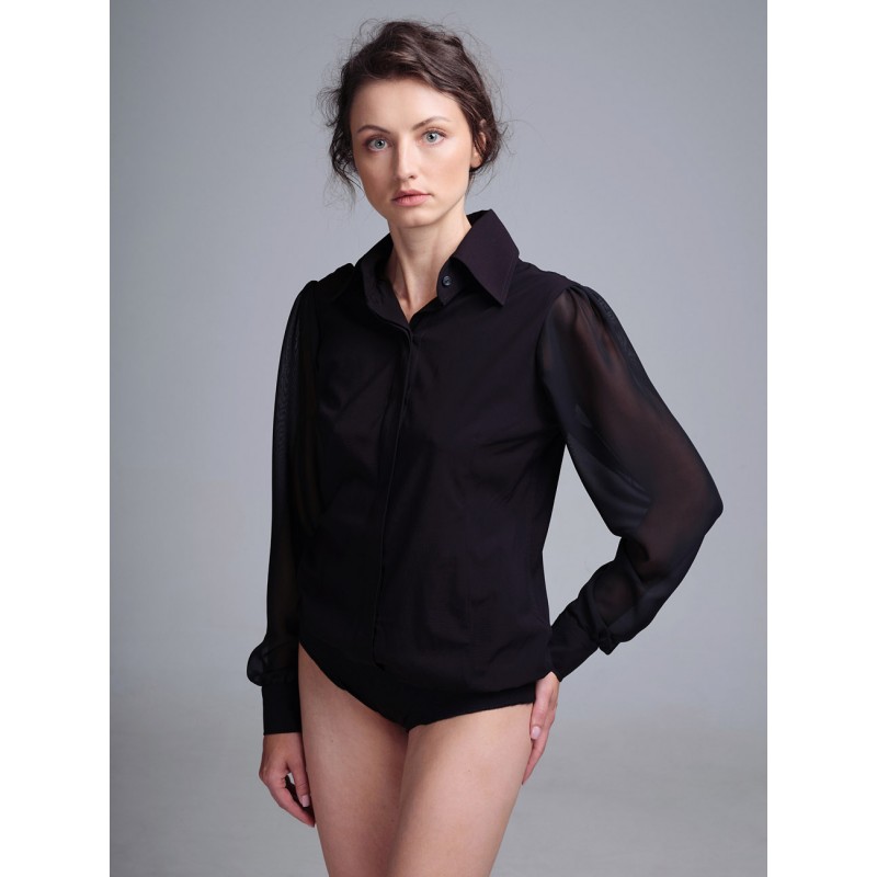 Body je zhotoveno z velice příjemné, lehce pružné košilové látky. Má skryté zapínání. Lehce nabírané rukávy a zadní sedlo je zhotoveno z lehce průsvitného šifonu. Spodní část body je z pružného úpletu na zapínání.
