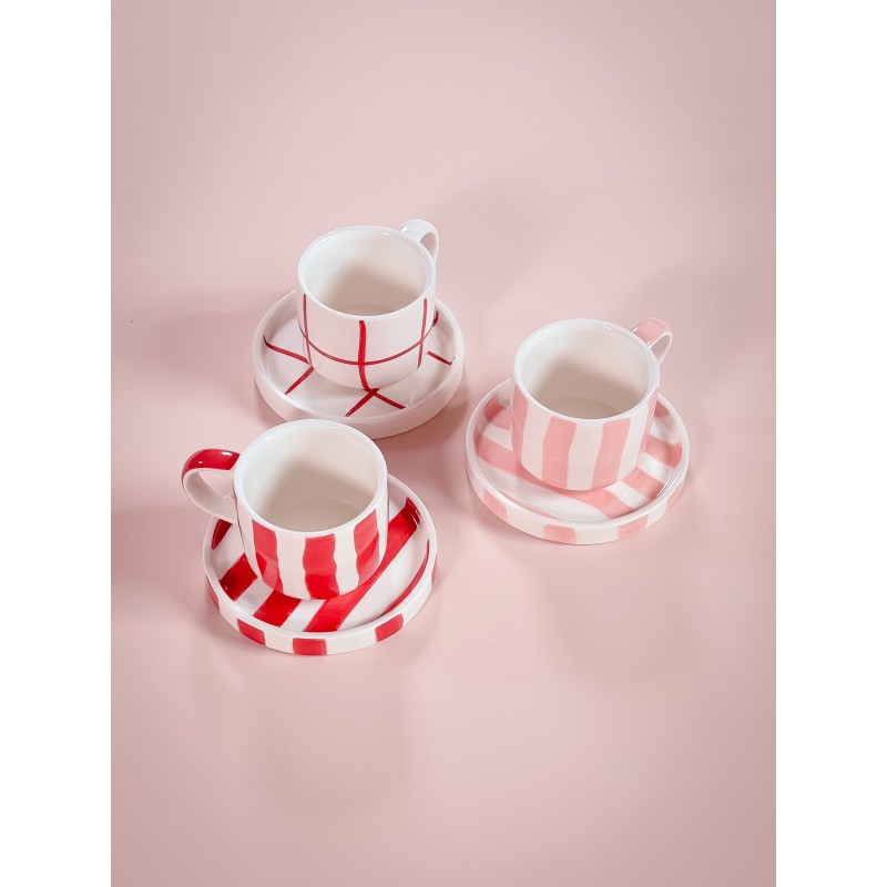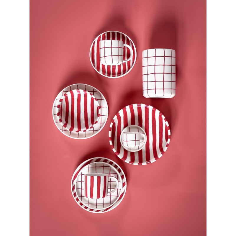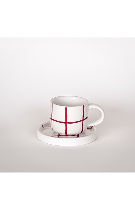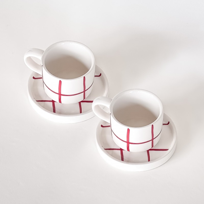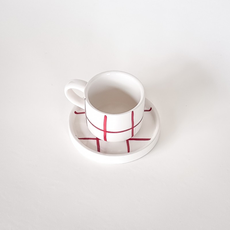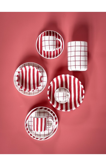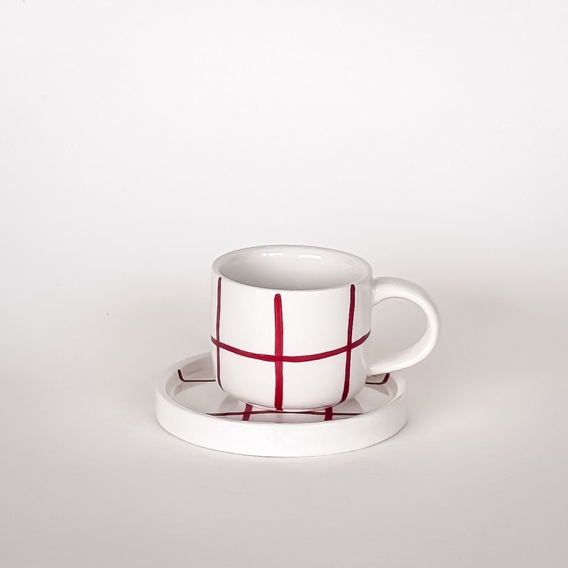 Espresso set z kolekce Grid se vyznačuje vzorem svislých a vodorovných linií. Šálky i podšálky jsou plně kompatibilní s kolekcí Stripes, což umožňuje libovolné kombinování barev a vzorů (mix & match) podle vlastního vkusu. Šálek je zmenšenou verzí klasického hrnku a plochý podšálek bez prohlubně slouží i pro servírování drobného občerstvení. Každý kus je ručně malovaný originál z vysoce kvalitní keramiky.